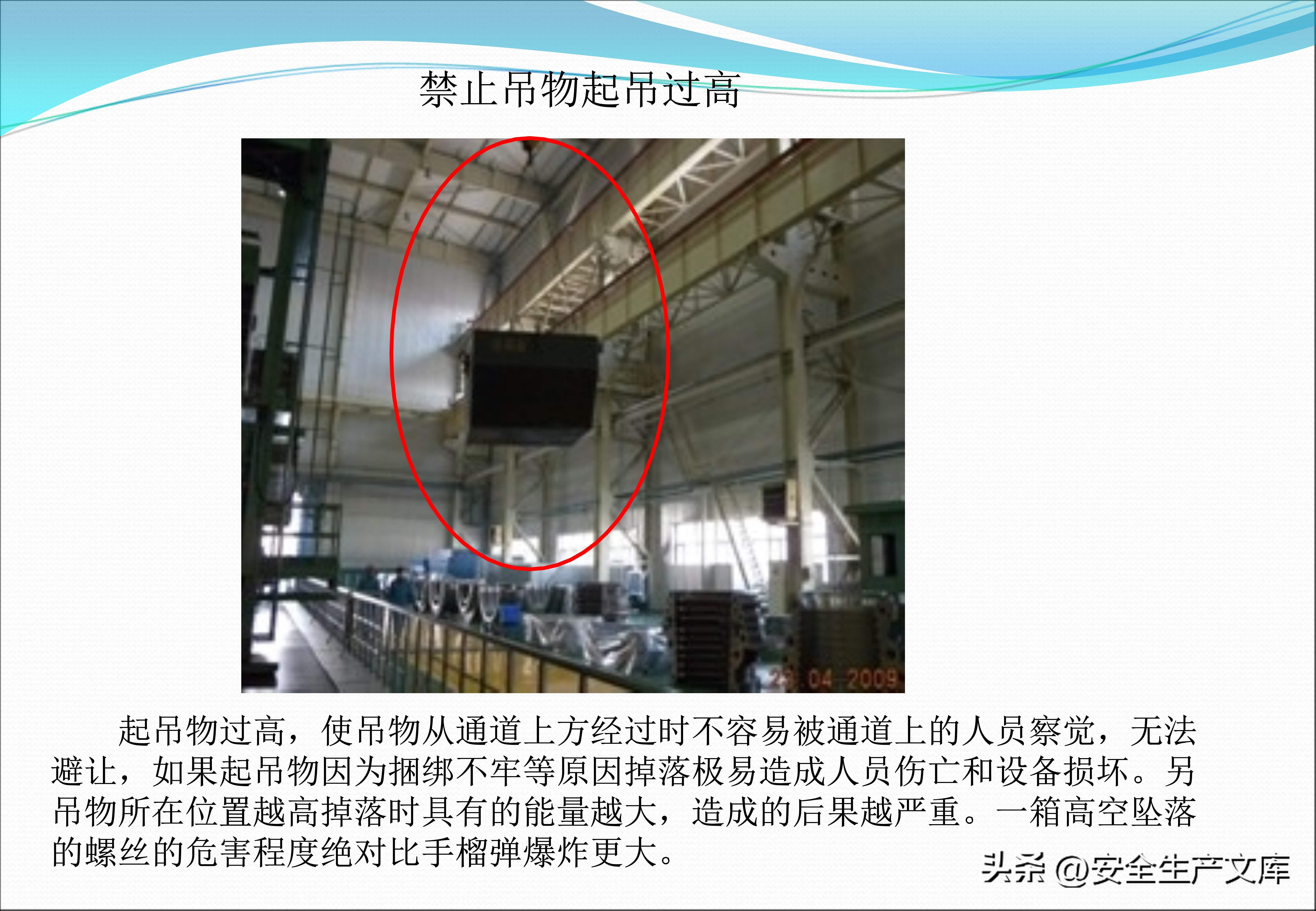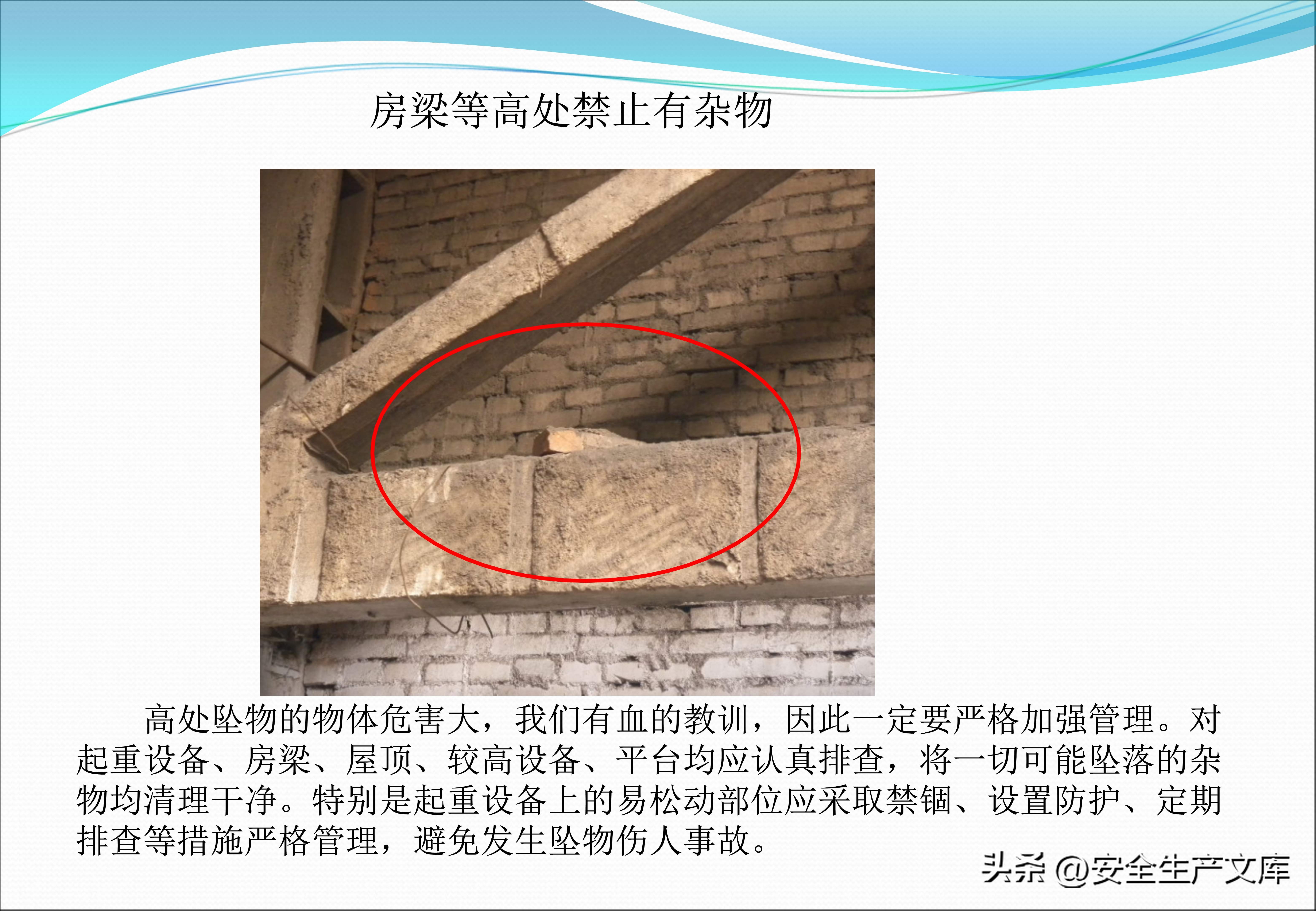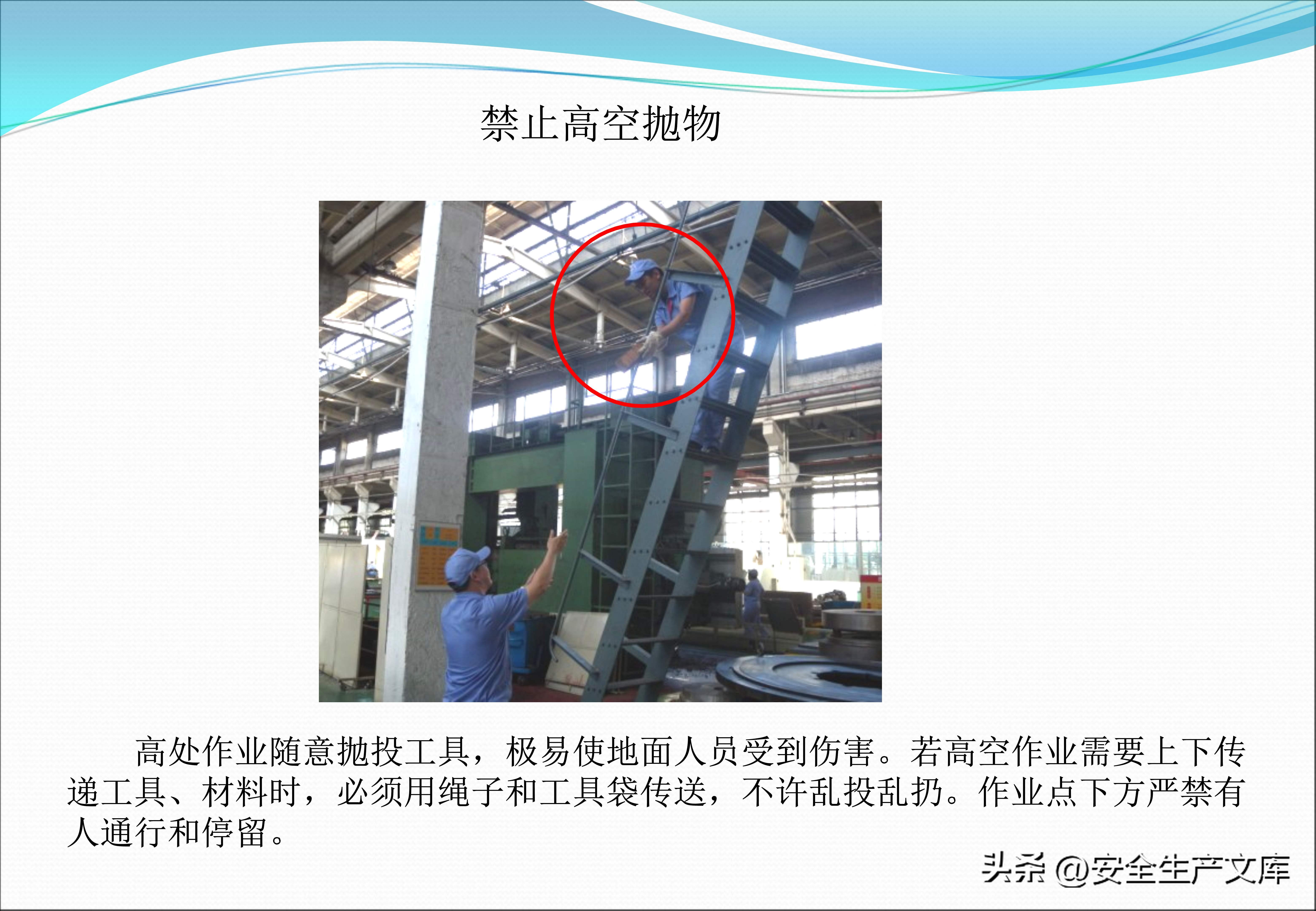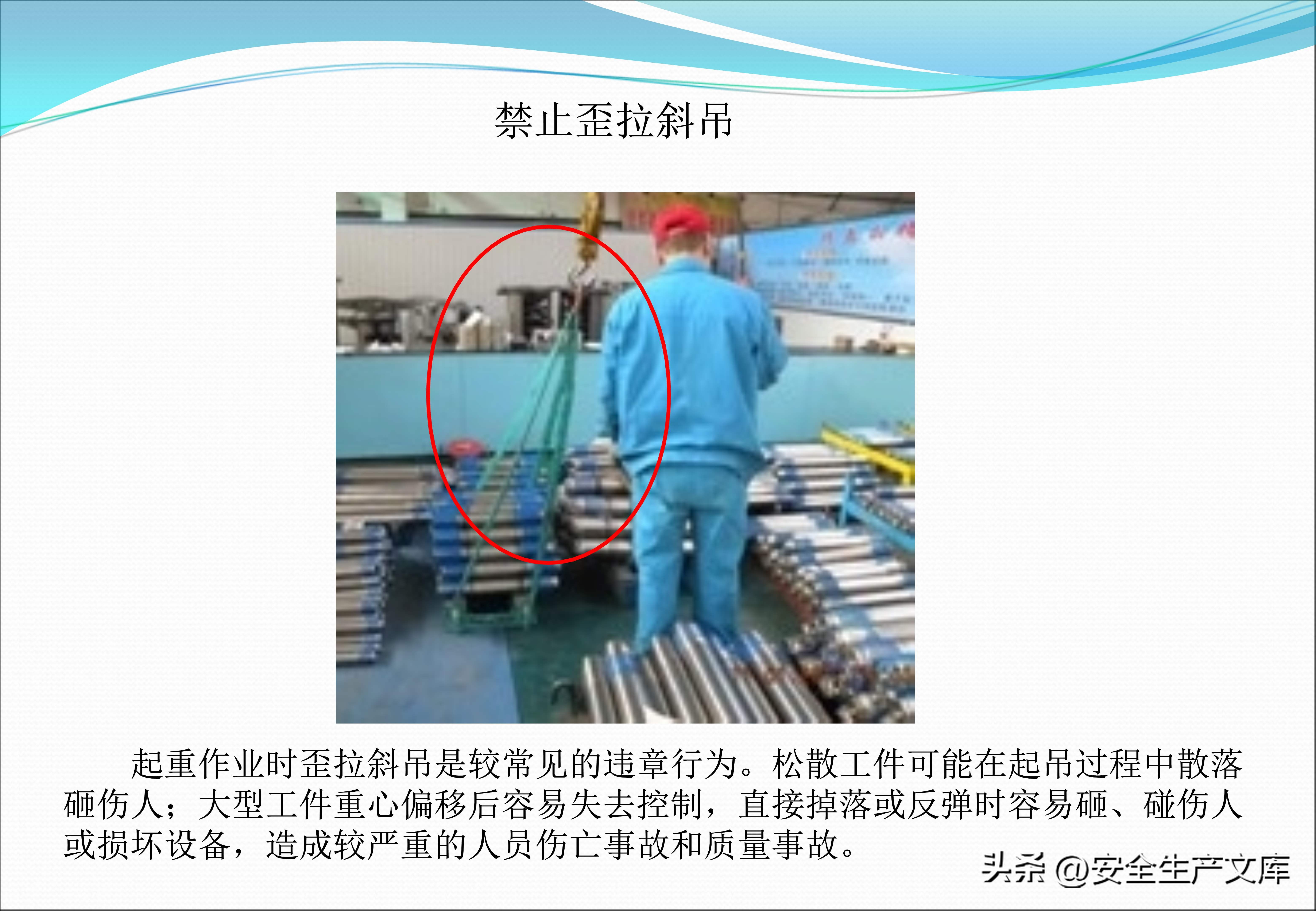 高空抛物这种行为与起吊作业违规行为一样令人触目惊心,在图例里,有一名工人,出于方便的目的,把扳手直接从脚手架上扔下去,险些砸中下方路过的同事,在起重作业当中,歪拉斜吊致使吊物摆动,撞倒了旁边的物料架。课件不断反复强调,高处作业一定要系挂安全带,起重作业严禁在起吊物下停留!这些规定可都是用生命换来的教训啊!