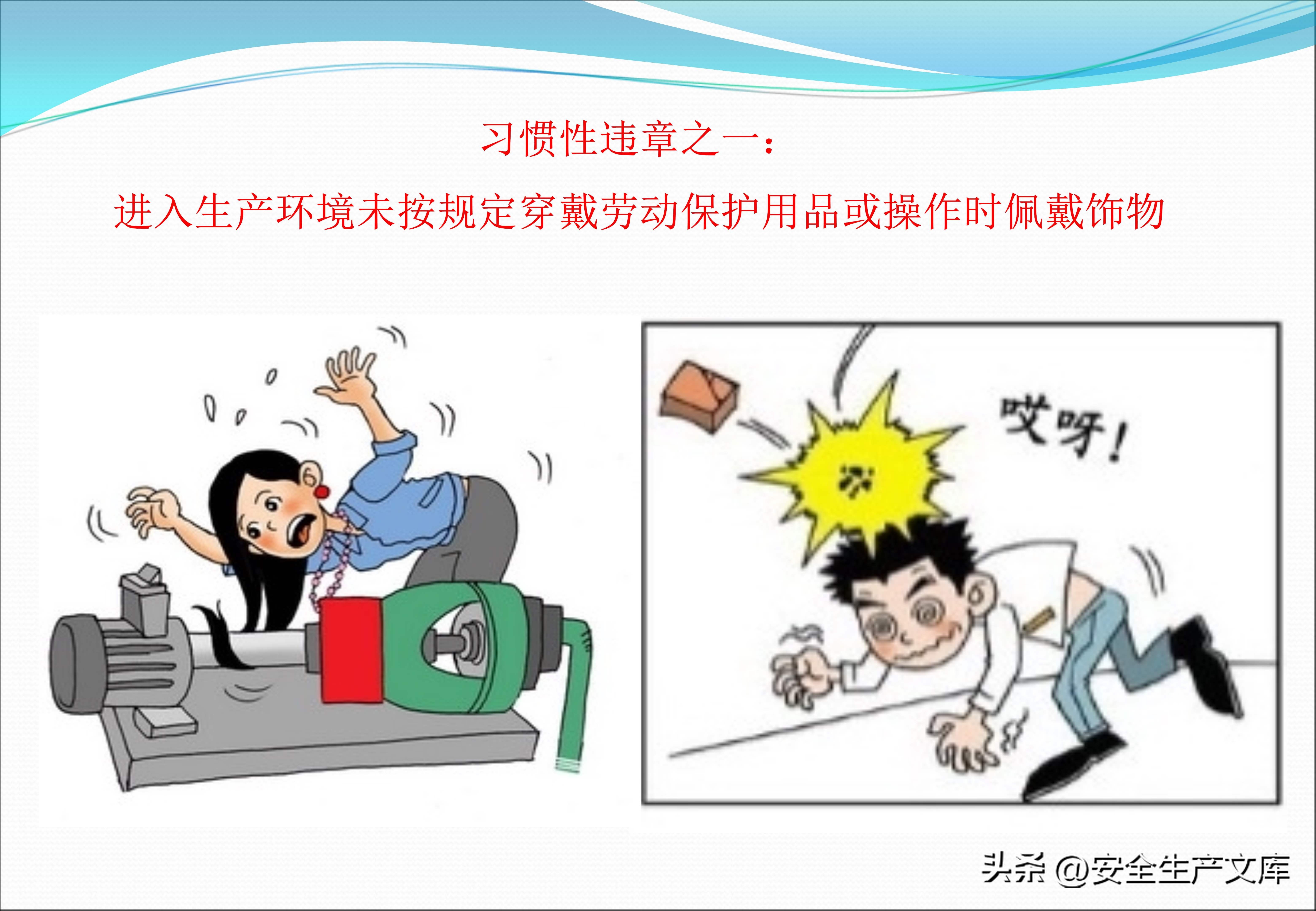 不是按规定穿戴劳动保护用品的行为,属于最常见的违章行为。课件里的图例表明,存在工人当在操作那些旋转机床的时候,戴着棉纱手套,最终那手套被机器给卷入进去了,手指当场就被绞断了。另外有人于砂轮作业之际不戴护目镜,飞溅起来的碎屑直接就射入眼睛里了。这些真实的场景使人触目惊心,每一张图都是有着血的教训的。劳保用品并非是摆设,关键时刻它就是保命符。