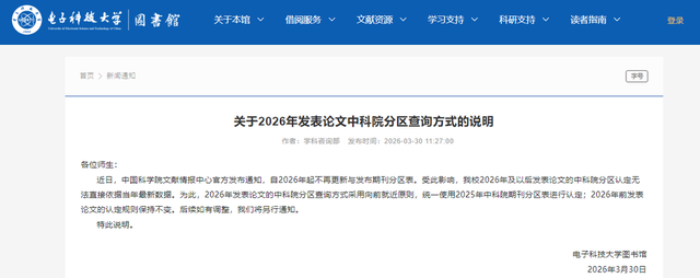 从这份说明可知,因受到中国科学院文献情报中心近期之通知产生的影响,电子科技大学对于二零二六年以及往后发表论文的中科院分区的认定,自此不再径直采用当年的最新数据,学校做出决定,采用向前就近的原则,统一运用二零二五年的中科院期刊分区表予以认定,在二零二六年之前发表的论文,其认定规则维持不变。
