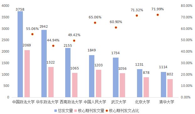 华东政法大学刊载出核心期刊论文数量为1322篇,中国人民大学此数量是1203篇,西南政法大学为1065篇,武汉大学有1056篇,北京大学是878篇,清华大学是802篇。然而要是去计算核心期刊论文在本校总发文量里所占的比例,清华大学凭借71.99%处于首位,北京大学以71.32%紧跟其后。这表明清北这两所学校尽管所发表的论文总数并不多,可是其中大部分都发表在了高质量的期刊之上。