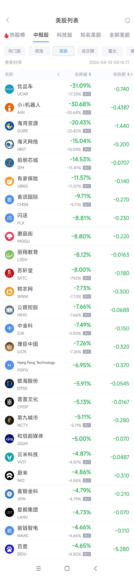 4月10日热门中概股多数下跌,中国金龙指数(HXC)收跌1.32%。