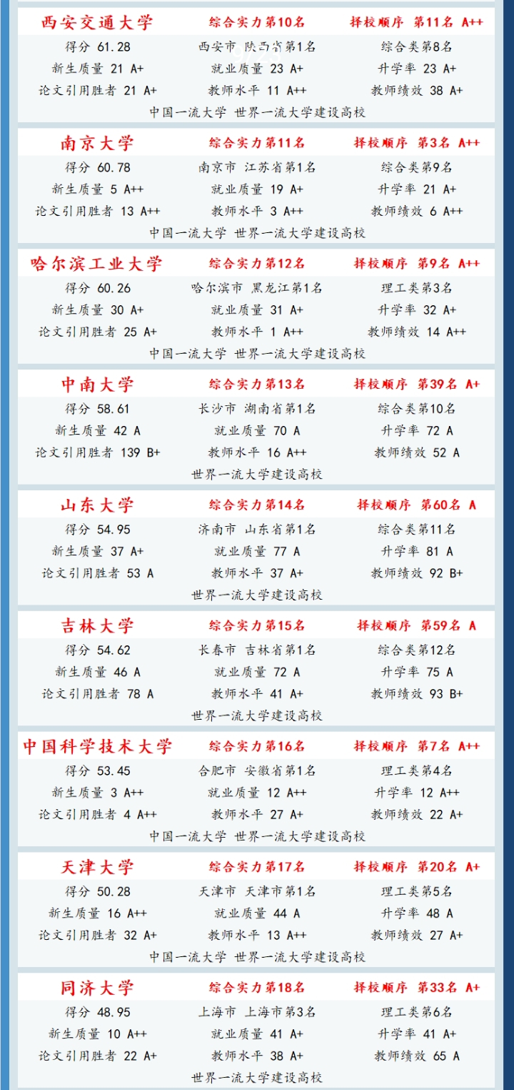 只不过今年中部那边的省份是有着进步的,湖北存在7所院校进入到前100当中,陕西是6所院校,四川同样有5所院校,西安交通大学重新返回前十仅仅是个缩影,实际上整个西部的高等教育都是在朝着上升的方向发展,国家针对中西部地区高校的投入开始呈现出成效,考生并不需要全都跑到北京、上海以及广州这些地方。