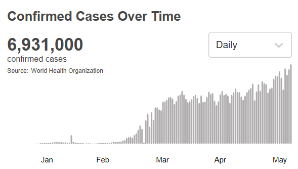 6月8日,按照世界卫生组织所发布的数据来看,全球累计确诊病例已然快要接近700万,而死亡病例是超过了40万例的。要极其值得警觉注意的是,在过去十天当中,有九天全球单日新增病例超过十万例,并且还刷新了单日最高纪录。这清楚明白地显示出,疫情在全球范围之内并没有得到有效的遏制。