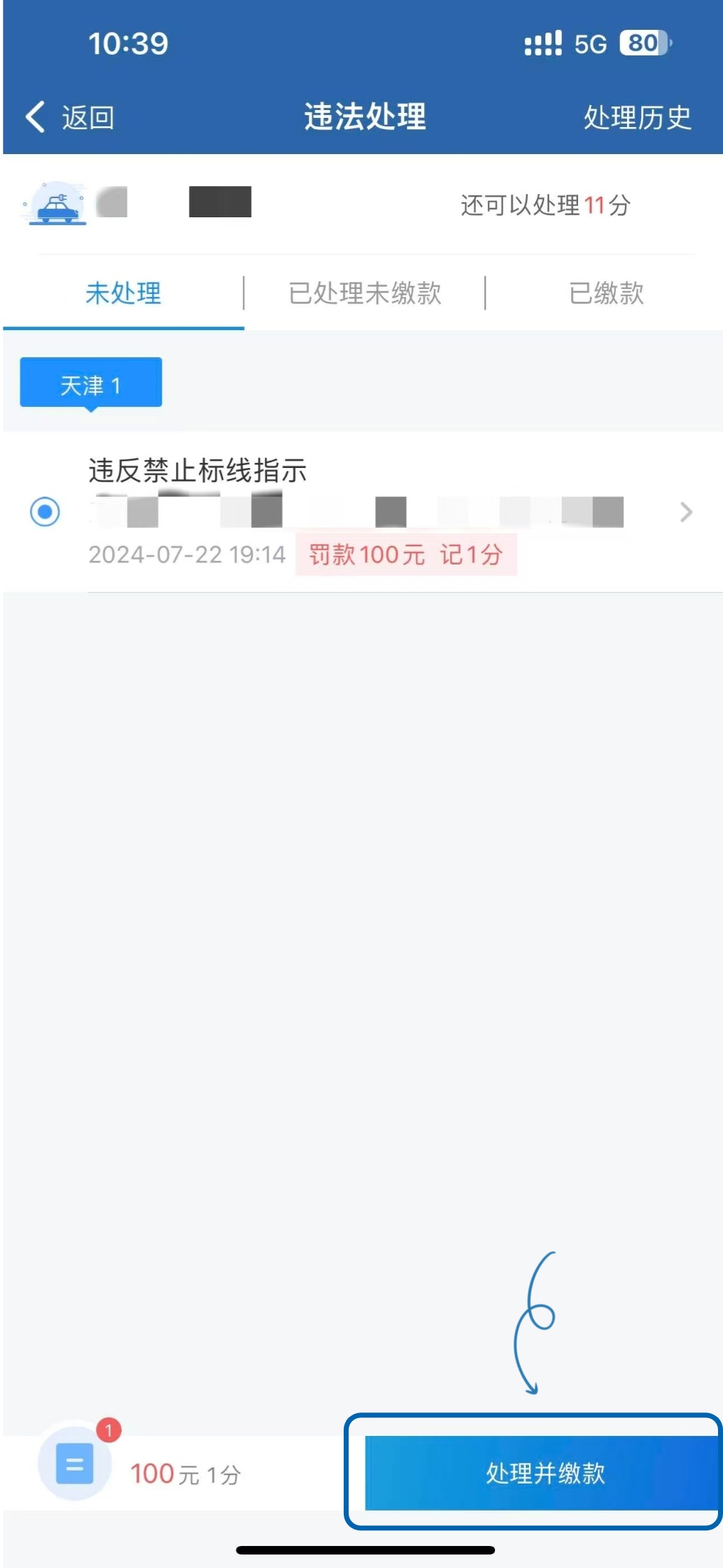 登上“交管12123”APP并绑定好车辆信息,然后再次点击首页的“违法处理”,找到那条核实过的违章记录,点进去之后在“未处理”界面看到它,选中这条记录,再点击右下角的“处理并缴款”按钮,线上处理流程是这样的。