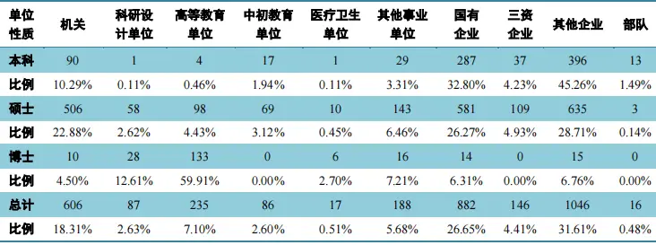 从各个学历层次去看,博士毕业生主要去向高等教育单位以及科研设计单位,占比为75.44%,而本科毕业生更多选择国有企业,占比68.66%,硕士毕业生更多选择其他企业,占比55.52%,呈现出清晰的学历层次就业方面的差异。