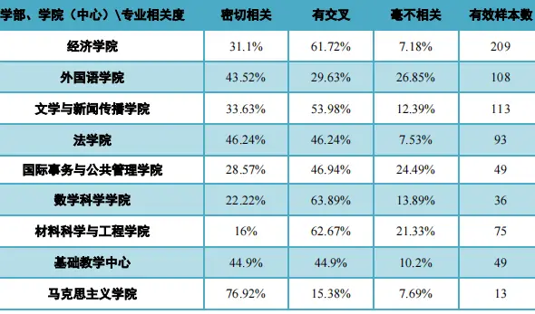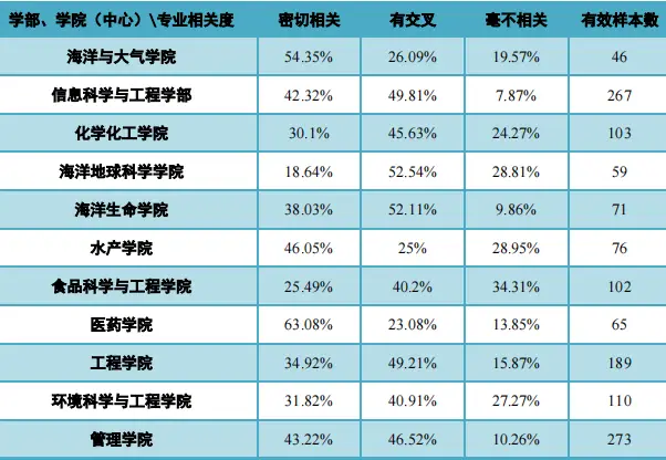 百分之三十七点三七的毕业生觉得当下所从事的职业跟所学专业紧密关联,另外百分之四十六点六三的毕业生认为二者存在交叉,总计超过八成之多。这意味着中国海洋大学的专业设置同市场需求之间的契合程度是比较良好的,学生在学校所学习的内容能够于工作当中获得实际的应用。