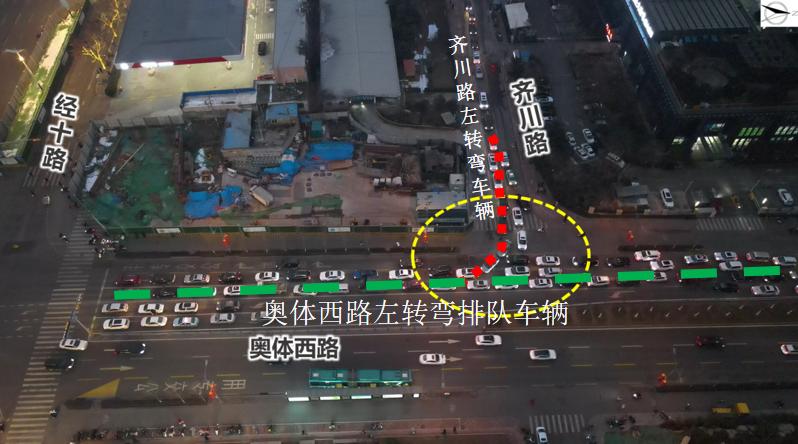 位于新泺大街跟奥体中路东口处,鉴于天泺路轨道开展施工实施封闭,致使车流量突然间急剧增加。进口道当中的左转车道仅有30米的长度,直行车辆与左转车辆拥挤得犹如搅成一锅粥的状态。调研组将左转车道延长至100米,排队所占据的空间变大了,彼此之间产生的干扰也就变少了。华阳路南延至省博物馆的路段、坤顺路向东延伸的这些断头路被打通以后,车辆无需再拥挤在经十路上,周边解放东路、转山西路的分流能力也随之得到了提升。