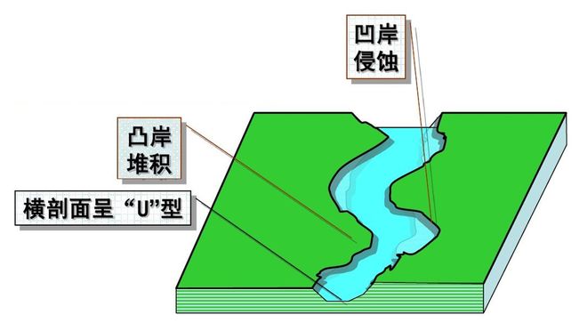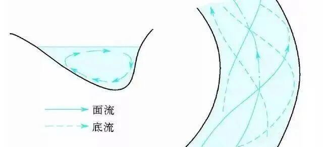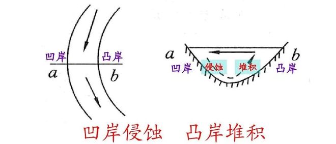 有凹岸侵蚀、凸岸堆积这现象的形成,重点是弯道处有横向环流。河水冲进弯道时,表层水流因离心力使它冲向凹岸,致使凹岸水位被抬高,比凸岸略高些。如此这般,底部水流在压力作用的情况,会从凹岸流向凸岸,构成一个完整的横向环流圈。