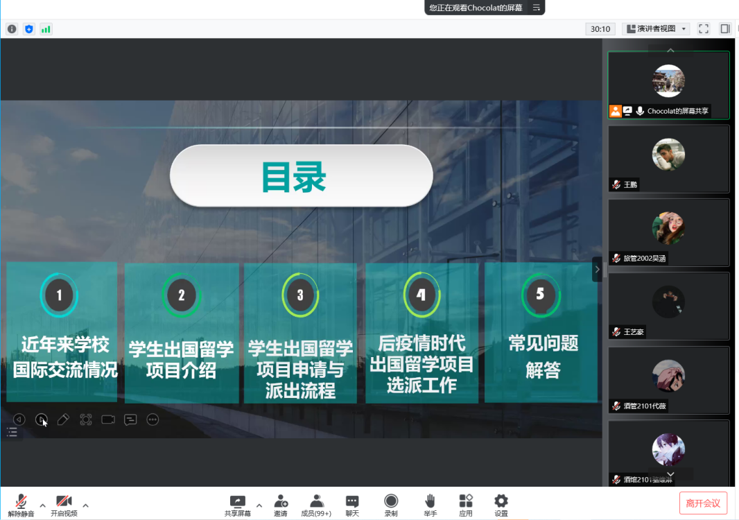 5月18日举办了经验分享会,邀请了4个同学,这4个同学才刚从留学归来,他们去往的国家各不相同,分别是法国、俄罗斯、日本以及土耳其,他们所讲述的内容极为具体,涵盖了海外课堂如何开展教学活动,课余时间怎样安排生活,在疫情状况下如何做好防护等方面,这些源自他们自身经历的一手信息,相较于在网上查询到的信息,要可靠得多。