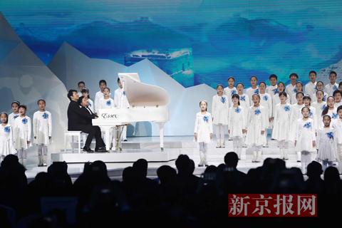 在发布仪式之上,身为著名钢琴演奏家的郎朗,为开幕合唱担当钢琴伴奏,于水立方的空间里头,他的琴声不断回荡着,与童声合唱相互配合,给严肃的发布仪式增添了艺术感染力,郎朗身着深色西装,弹奏得格外投入。