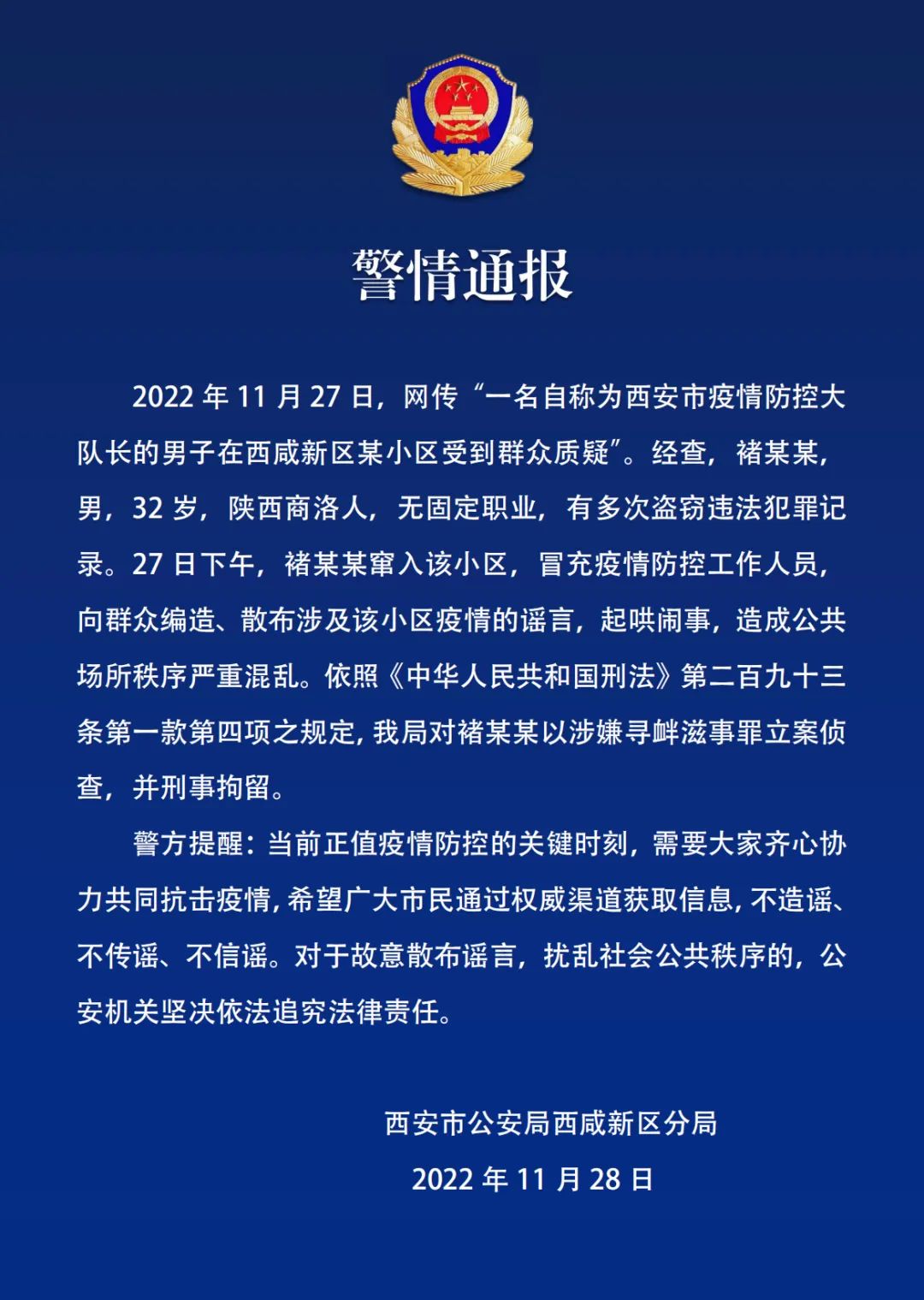 2022年11月接近尾声的时候,在西安西咸新区处,出现了一起能让人警觉醒悟的案件。一名年龄为32岁,且有着违法犯罪以前经历的没有工作的男子褚某某,假装成“疫情防控大队长”进而进入小区,虚构并且传播疫情方面的谣言,致使群众聚集起来,还造成了秩序的混乱。他所做出的行为已然涉嫌刑事犯罪。