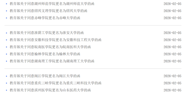 å嫿¯æ¹å·å¸èå¦é¢æ´å为æ¹å·å¸è大å¦ï¼ç»å ´æçå¦é¢æ´å为ç»å ´å¤§å¦ï¼èµ¤å³°å¦é¢æ´å为赤峰大å¦ï¼æ·®é´å·¥å¦é¢æ´å为淮å®å¤§å¦ï¼å®å¾½ç§æå¦é¢æ´å为å®å¾½ç§æå·¥ç¨å¤§å¦ï¼çåå»å¦é¢æ´å为çåå»ç§å¤§å¦ï¼æ¦æå¦é¢æ´åä¸ºæ¦æå¤§å¦ï¼æ¹åçå·¥å¦é¢æ´å为æ¹åç工大å¦ï¼é½æ±å¦é¢æ´åä¸ºé½æ±å¤§å¦ï¼éåºä¸å³¡å¦é¢æ´å为éåºä¸å³¡ç§æå¤§å¦ï¼æ»¨å·å»å¦é¢æ´å为山ä¸å»è¯å¤§å¦ã