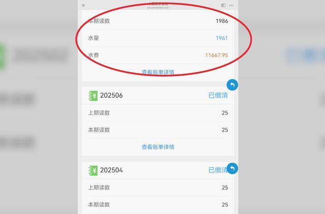ç女士说ï¼å¥¹çè¿ä¸ªæ¿åå·²ç»ç©ºç½®æä¸¤å¹´å¤æ¶é´äºï¼æ°´è¡¨æ¯æ¯ä¸¤ä¸ªææä¸æ¬¡ï¼2025å¹´6ææ¥çè´¦åæ¶è¿ä¸åæ£å¸¸ã2025å¹´8æ13æ¥ï¼å¥¹çªç¶æ¶å°äºä¸å¼ å·¨é¢è´¦åï¼è¯´å®¶ä¸ç¨æ°´éè¾¾å°äº1961å¨ï¼æ°´è´¹11667.95ä¸å ã