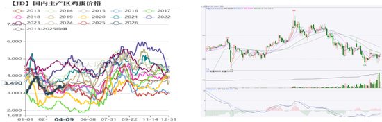 本周因中下游企业开始陆续补库,加上五一节前备货预期,需求端相对偏好,市场维持谨慎看涨情绪,现货价格呈现小幅偏强震荡。截止到4月9日,主产区均价为3.49元/斤,较上周同期上涨0.16元/斤,邯郸地区鸡蛋均价为3.07元/斤,较上周同期上涨0.02元/斤。因市场对3月换羽以及延淘后增加后续供应压力,盘面较为承压,但基去年下半年低补栏预期,底部支撑较强。