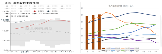 就养殖利润来看,除了河北一些低价区,全国其他主产区现货价格在完全成本附近,河北低价区现货价格在当日成本附近,整体是偏向微幅盈利的,因此养殖端现阶段相对比较纠结淘鸡节奏,观望情绪较浓,一方面是3月换羽以及延淘情况的不确定性,一方面去年下半年鸡苗低补栏的支撑。但有一个逻辑相对较为确定,若现货价格持续高于养殖成本价,养殖端惜淘情绪是较强,而若现货价格低于当日成本较多,养殖端基于对未来行情的担忧,淘鸡节奏是相对加快。