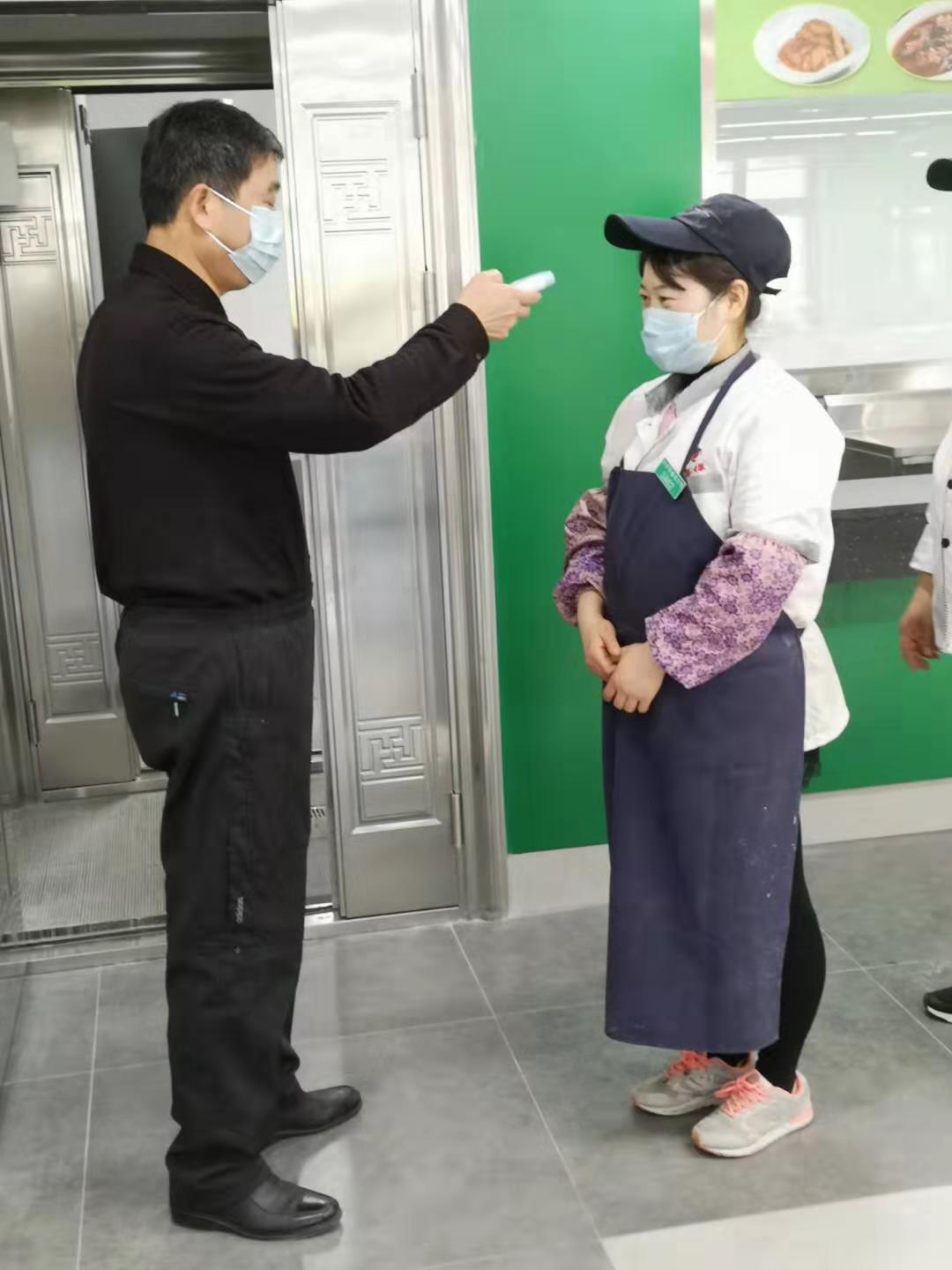 关于工作人员的健康管理,其严格程度也是一样的。每一位上岗工作的员工,都需要在每天报告自己的体温以及身体的状况,并且在整个操作过程当中全程佩戴口罩。食堂方面,也向师生提出了建议,要佩戴口罩去购买餐食,同时鼓励将餐食打包之后带走,以此来减少在食堂内堂食时人员聚集的情况,从入口这个地方开始,就降低了病毒进行传播的可能性。